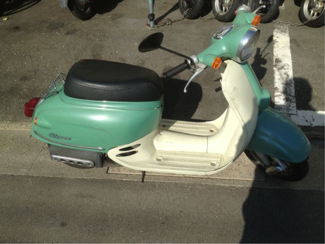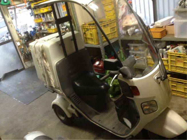 酒屋さんや料理屋さんが配達なんかでよく使っているモデルです。屋根付き3輪という珍しい形ですが、エンジンは50cc。普通のスクーターと大差ありません。車重がありすぎてスピードも50kmそこそこ、あ、原付なので30km制限がありますが、まあ、飛ばす人は飛ばしますよね。温かい料理を早く届けたいと思うのも、商売ではなく人情です。