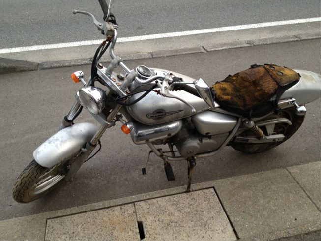 シートx、リヤフェンダーx、あちこちサビサビ、おまけに鍵も紛失されててありません。タンクも実質使用不能。