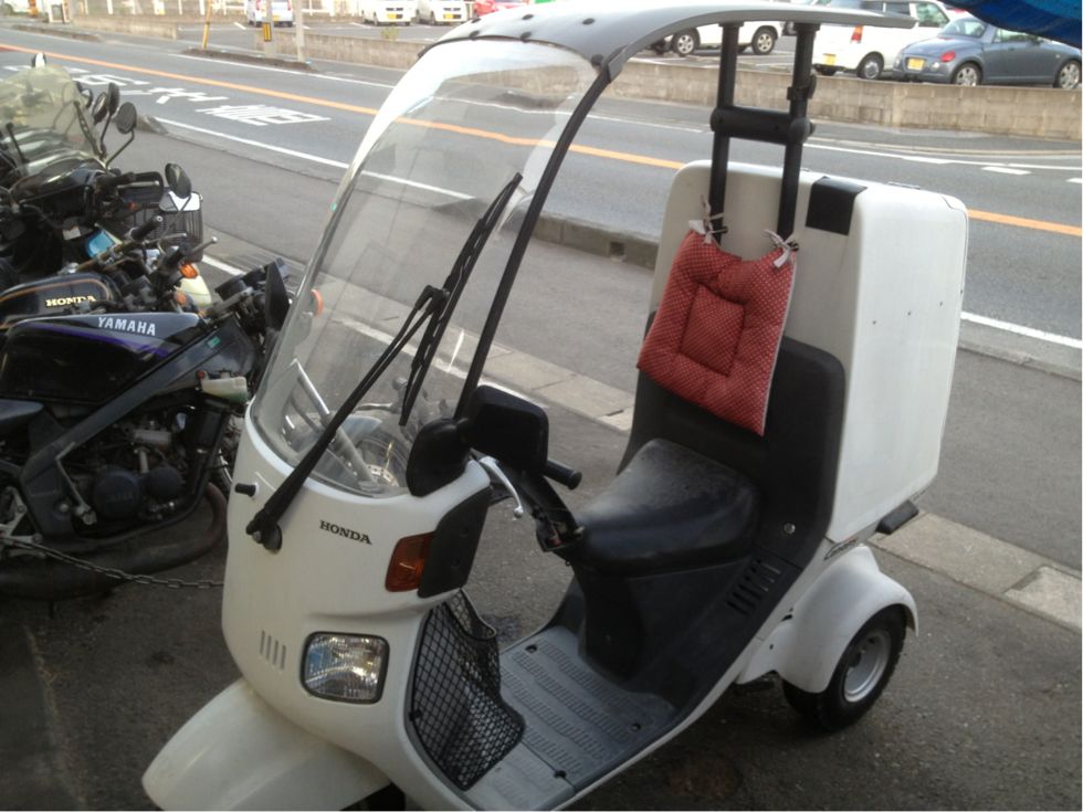 三輪の屋根付きバイクです。ピザ屋さんでも有名ですね。