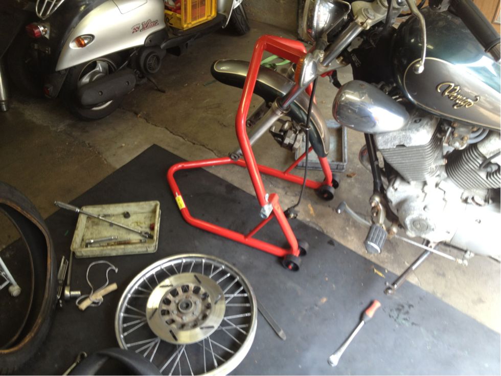 ビラーゴ250はセンスタがない上、エキパイが下に回っているモデルなので、フロントタイヤを替えるのに、写真のような特殊スタンドが必要です。