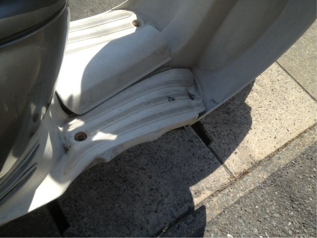 随分珍しい箇所がひん曲がっていたので撮ってみました。聞けば、正面からぶつかって、横向きに倒れた際に曲がったとのこと。残念ながらフレームへのダメージが大です。