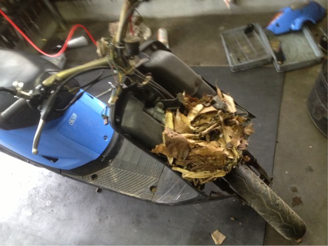 実は3KJ型のこの部分には、いろんなものが溜まりやすいです。蜂の巣だったり、カマキリの卵だったり、ゴミくずだったり。通常は密閉状態なのですが、経年劣化や事故でカウルが曲がったり欠けたりすると、その隙間から異物が入り込んで溜まりやすくなるんです。