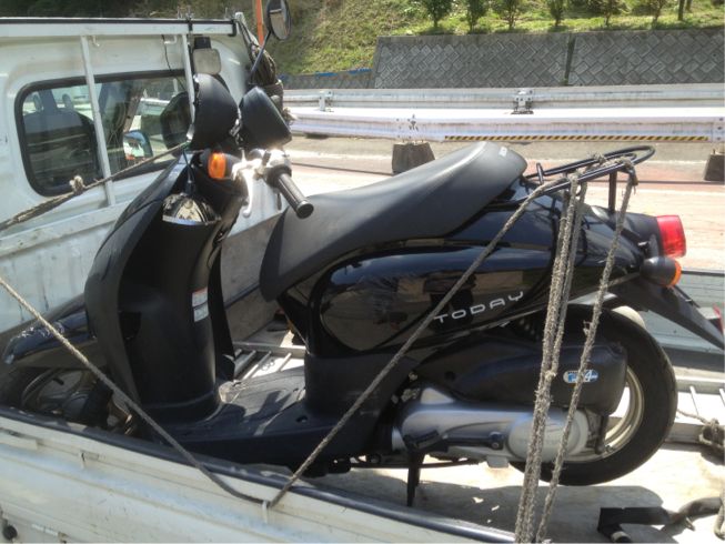 事故車です。綺麗に折り曲がっています。トゥデイは初期型AF61ですが、以前もこんな感じで綺麗に折り曲がってるのを回収したことが。フレームが柔らかいのかな? いずれも登場者は大した怪我もなかったとのこと。不幸中の幸いでした。
