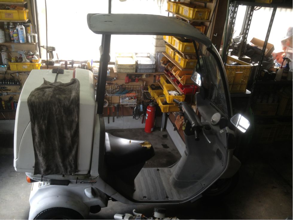 屋根付き3輪スクーターです。ノーマル車は原付免許で運転可能。写真の車体は、リヤタイヤにスペーサーをあてて、車幅をちょっと増加させて、ミニカー登録させた改造車です。なので、運動するのに普通免許が要りますが、ヘルメット着用義務や2段階右折等が回避できる裏技?仕様です。